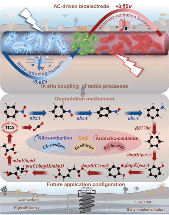 硝基芳香族化合物(NACs)作为常见的工业原料和污染物,广泛存在于水体和沉积物中,对生态系统和人类健康构成严重威胁。由于NACs的难降解性和沉积物中传质效率低的问题,传统生物修复技术难以有效去除这些污染物。因此,探索新型高效的污染修复技术显得尤为重要。本研究提出通过交流电(AC)调控微生物氧化还原过程,实现难降解NACs的原位深度矿化,为沉积物修复提供了一种低碳高效的解决方案。