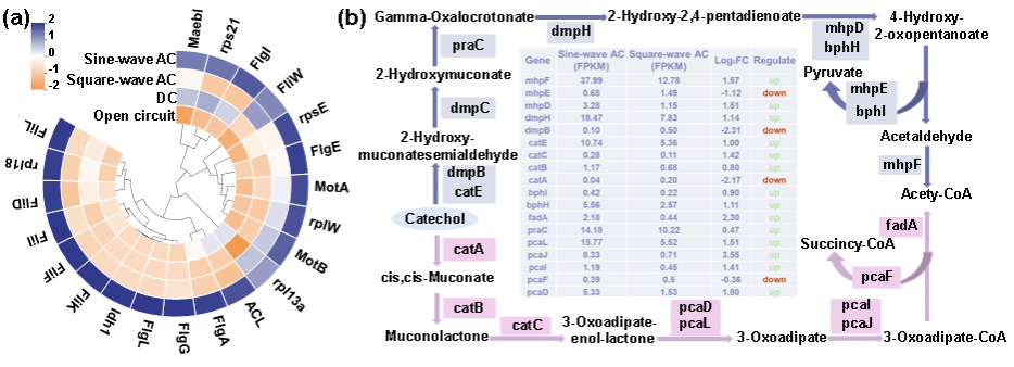电刺激下微生物群落结构显著重塑,硝基还原菌和芳香氧化菌的富集明显增强污染物的协同降解能力。宏转录组结果揭示,正弦波AC显著上调与硝基还原、芳香环开环及电子传递相关的关键功能基因,从分子水平驱动污染物高效转化。非靶向代谢组分析进一步表明,该刺激模式重构代谢通路,促进小分子酸的积累,为污染物的彻底矿化提供内源电子与碳源支撑,展现出协同调控微生物-电子-代谢网络的优势。