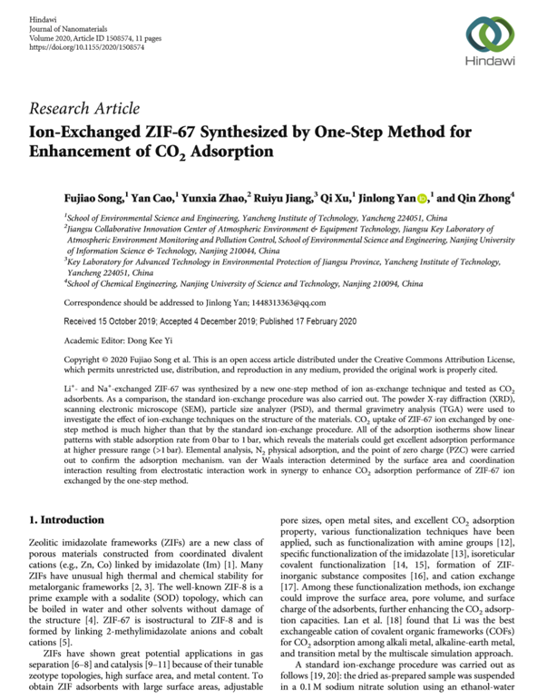 近日,我院宋夫交博士(第一作者)的研究论文“Ion-Exchanged ZIF-67 Synthesized by One-Step Method for Enhancement of CO2 Adsorption”在《Journal of Nanomaterials》上发表。《Journal of Nanomaterials》是SCI四区期刊(2019年影响因子为2.233)。本论文采用一步法合成了Li+、Na+离子交换的沸石咪唑骨架材料ZIF-67,并研究了其对CO2的吸附性能。
