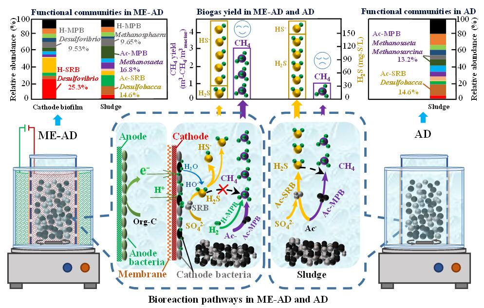首次提出利用电化学方法解决厌氧消化面临的硫化氢毒性抑制难题。阐明了电化学-厌氧消化(ME-AD process)耦合体系中硫转化路径及产甲烷增效机制。所提出的ME-AD工艺既可解决硫化氢毒性抑制又可增效产甲烷。该工艺甲烷产出经济效益是电能输入成本的20倍,可取代传统投加碱性药剂控制硫化氢毒性的方法,近年化学药剂价格不断攀升,该工艺极具经济优势。该技术可原位产生碱度,无二次污染,适用性强,可运用于多种类型的厌氧消耗工艺,技术模式具备较强的推广性。