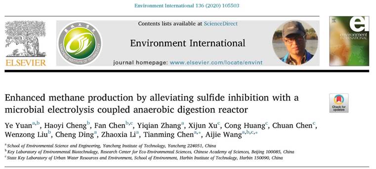 近日,我院远野博士为第一作者、盐城工学院为第一单位的研究论文《Enhanced methane production by alleviating sulfide inhibition with a microbial electrolysis coupled anaerobic digestion reactor》(Yuan et al., Environ. Int., 2020, 136, 105503)在环境领域国际公认顶级期刊《Environment International》发表,2019年影响因子7.943,近5年影响因子8.763。该论文的发表将为我校环境学科ESI排名前进做出贡献。本研究由远野博士承担的国家自然科学青年基金(51608467)资助完成。