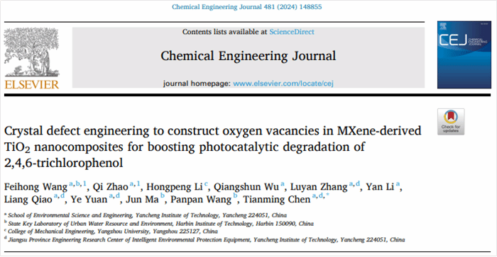 近日,学院王飞鸿博士和在读硕士研究生赵琦为共同第一作者、陈天明教授为通讯作者、盐城工学院为第一单位的研究论文《Crystal defect engineering to construct oxygen vacancies in MXene-derived TiO2 nanocomposites for boosting photocatalytic degradation of 2,4,6-trichlorophenol》(Wang et al., Chem. Eng. J., 2024, 481, 148855)在工程技术领域权威期刊《Chemical Engineering Journal》发表。该期刊2024年影响因子15.1。
