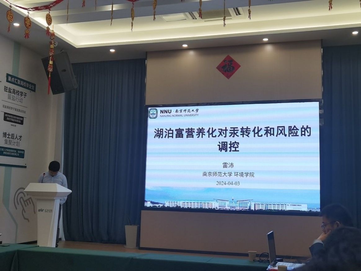 雷沛副教授做了题为“湖泊富营养化对汞转化和风险的调控”的学术报告。雷教授在报告中,分享了汞在湖泊水体中的生物转化机制,并对其毒性风险进行分析。雷教授还展望了碳达峰与碳减排期间二氧化碳浓度对水中汞生物转化的影响。在师生交流环节中,陈院长指出,雷教授为深入研究"有机质组成汞甲基化微生物甲基化"动态耦合作用关系,对我国典型富营养化湖泊(巢湖、东湖和滇池)进行研究,重点关注不同富营养化情景下藻源性有机质对甲基汞生成的影响,探究有机质关键组分对汞甲基化的调控作用,揭示不同汞甲基化微生物对藻源性有机质的响应机制。