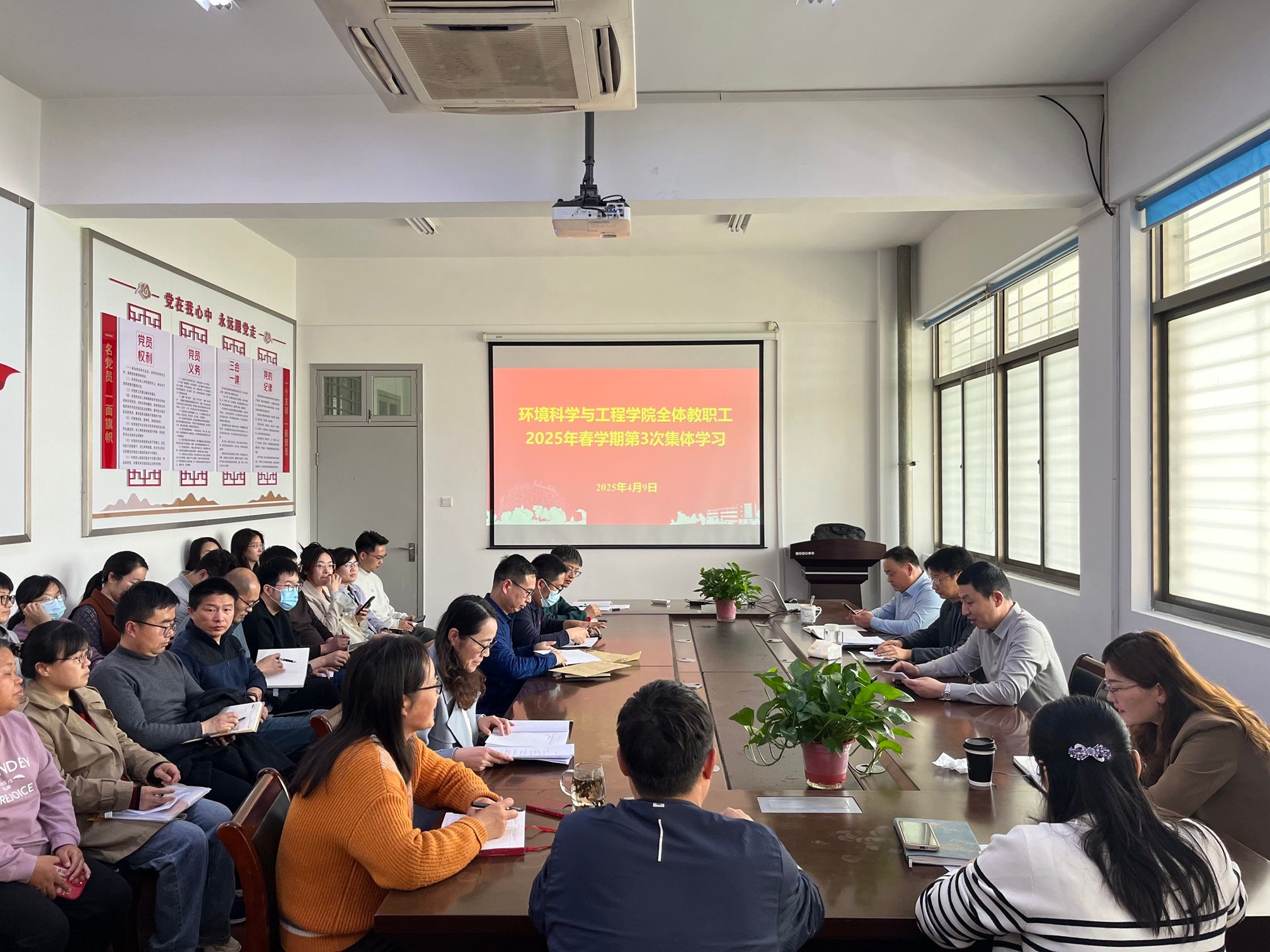 4月9日下午,环境学院在学院会议室召开2025年春学期第三次教职工政治理论会。学院党总支书记孟鑫主持并领学习近平总书记在《求是》杂志上发表的重要文章《健全全面从严治党体系》《注重家庭,注重家教,注重家风》、习近平总书记在二十届中央纪委四次全会上发表的重要讲话精神、中国共产党第二十届中央纪律检查委员会第四次全体会议公报精神。院长陈天明,副院长杨百忍、李璇出席,全体教职工参加。