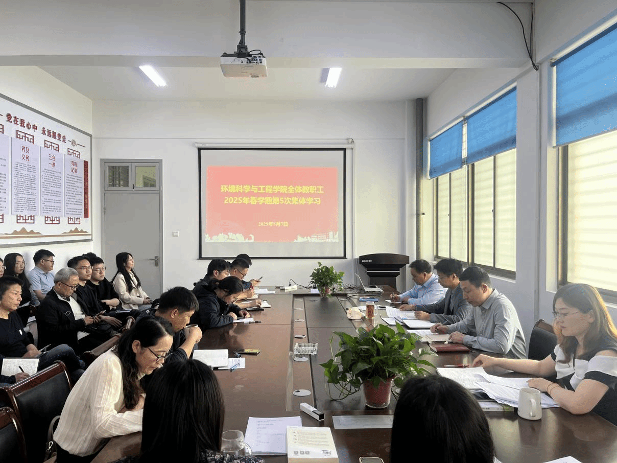 5月7日下午,环境学院在学院会议室召开2025年春学期第五次教职工政治理论学习会。学院党总支书记孟鑫主持会议并领学了《习近平总书记关于党的建设的重要思想》《习近平总书记关于做好新时代党的统一战线工作的重要思想学习读本》《论坚持和完善人民代表大会制度》等。院长陈天明、副院长杨百忍、李璇出席,全体教职工参加。