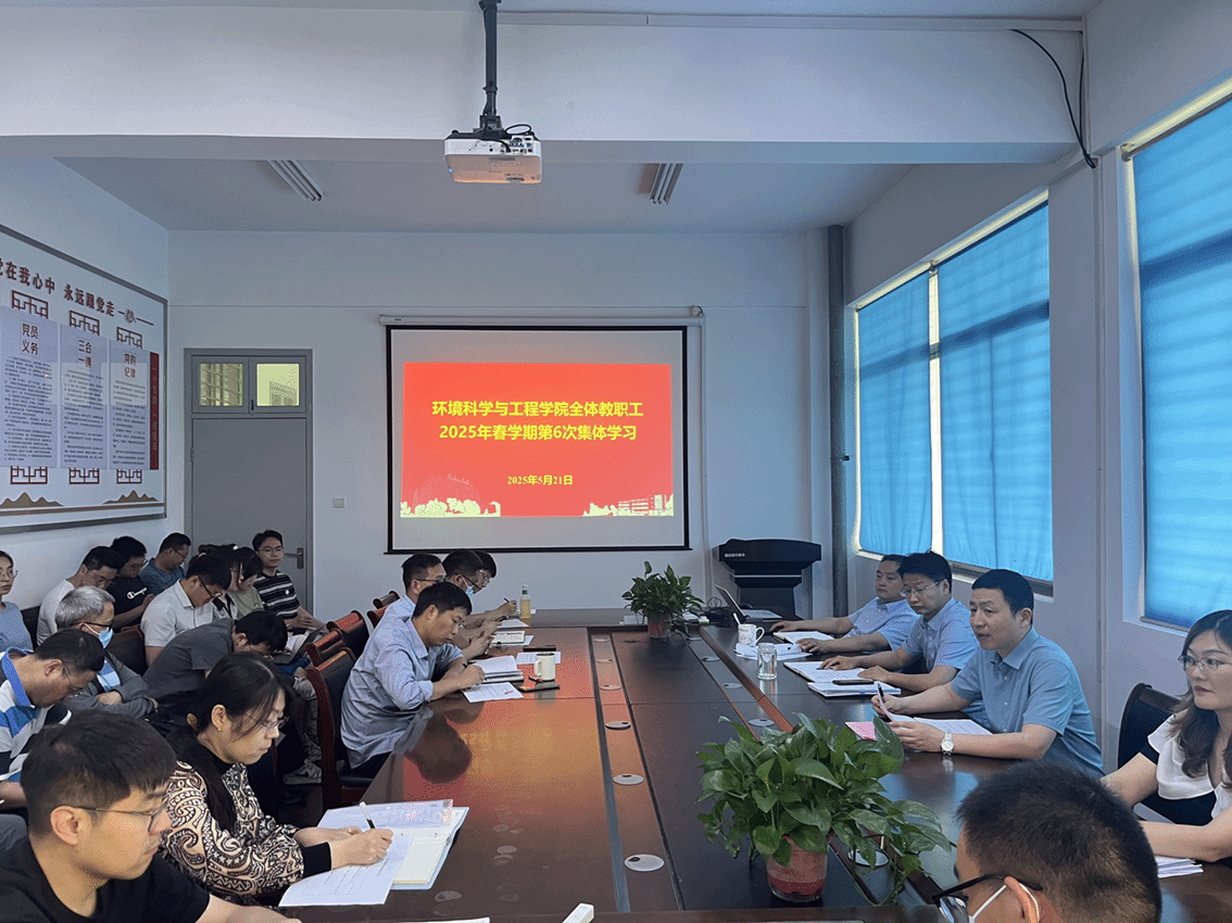 5月21日下午,环境学院在学院会议室召开2025年春学期第六次教职工政治理论学习会。学院党总支书记孟鑫主持。院长陈天明领学《习近平关于自然资源工作论述摘编》《习近平关于治水论述摘编》等。副院长杨百忍、李璇出席,全体教职工参加。