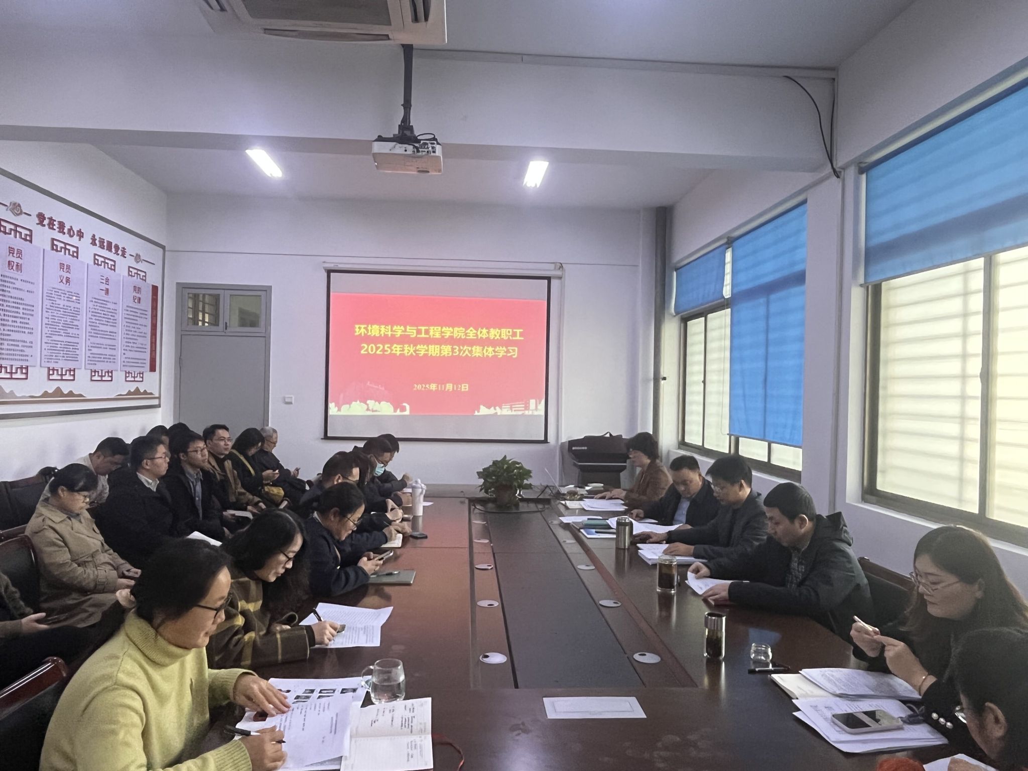 11月12日下午,环境学院在北校区学院会议室召开2025年秋学期第三次教职工政治理论学习会。党总支书记孟鑫主持会议,院长陈天明,副院长杨百忍、李璇出席。党总支副书记王丽坤领学党的二十届四中全会精神、《习近平谈治国理政》第五卷第十个专题中习近平总书记在首个全国生态日之际作出的重要指示精神等内容。全体教职工参加。