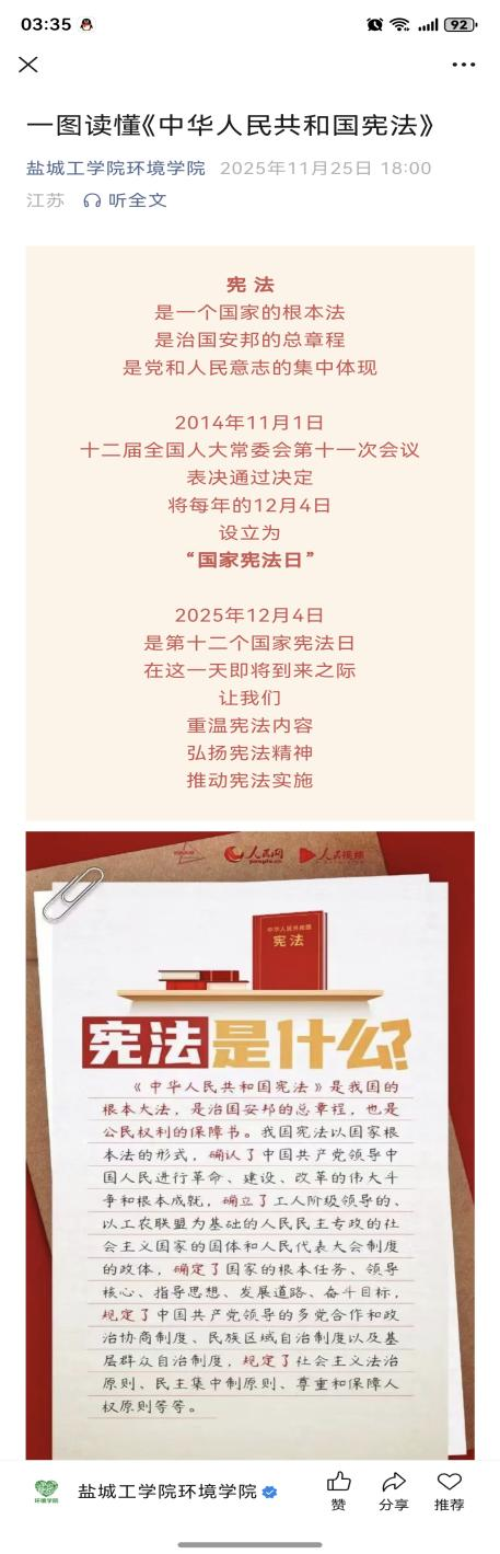 为深入学习宣传贯彻习近平法治思想,弘扬宪法精神,维护宪法权威,11月底至12月7日,在第十二个“国家宪法日”来临之际,环境学院开展“宪法宣传周”系列活动,为推动学院高质量发展营造良好法治环境。