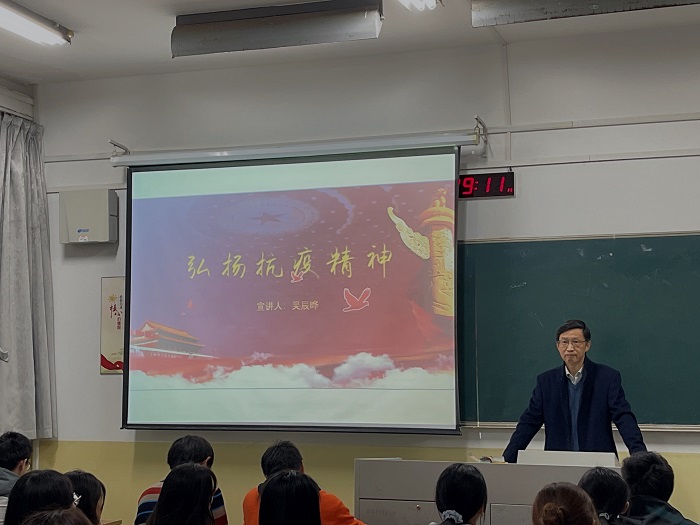 周政指出,一个国家要有精神,它是国本;一个民族要有精神,它是脊梁。在第十二届全国人民代表大会第一次会议闭幕会上,习近平总书记高度概括了中国精神的本质内涵,“实现中国梦必须弘扬中国精神。这就是以爱国主义为核心的民族精神,以改革创新为核心的时代精神。这种精神是凝心的兴国之魂、强国之魄。”理想、情怀、奉献、奋斗、创新这些关键词,犹如一根根红线贯穿于伟大精神之中,指引方向,催人奋进。周政强调,作为新时代大学生,要增强爱国主义深厚情感,确立报国的崇高志向, 保持对远大理想和奋斗目标的执着追求,让坚定的理想信念转化为努力学习、提高能力的不竭动力。