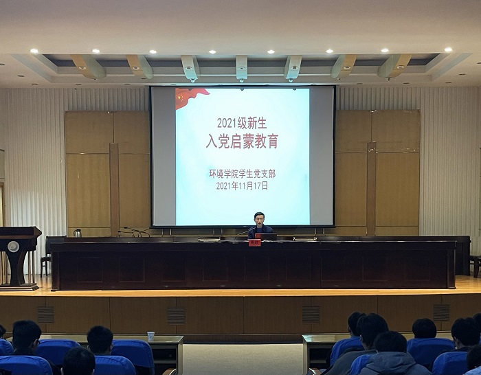11月17号晚,环境学院在北校区图书馆报告厅举行了2021级新生入党启蒙教育活动。学院党总支副书记兼学生支部书记周政主讲,新生辅导员、全体大一新生参加。