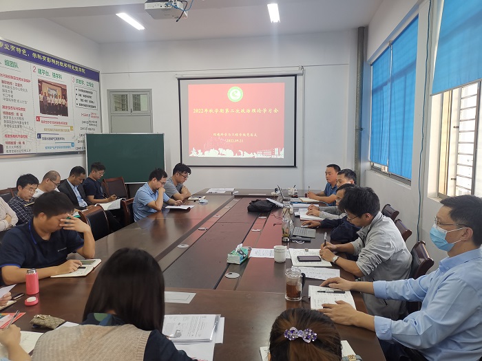 9月21日下午,在北校区大学生活动中心三楼会议室,环境学院组织了2022年秋学期第二次师生政治学习会,会议由学院党总支书记陈阳主持,院长严金龙领学,全院教职工参加。