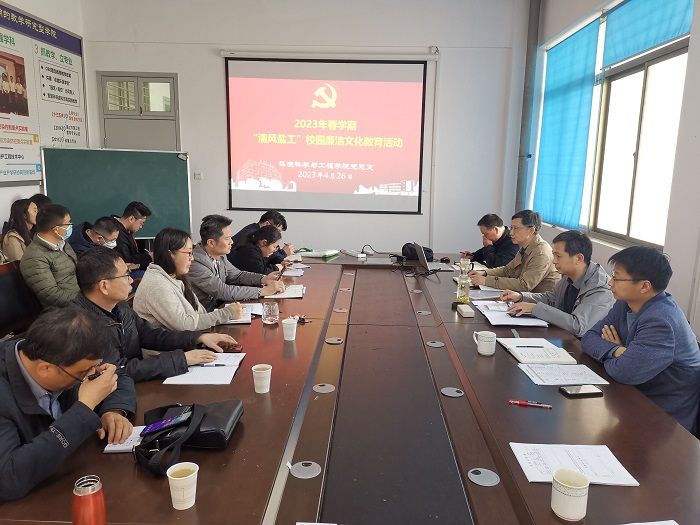 为进一步加强学院廉洁教育工作,增强教职工廉洁意识,营造立德树人的良好教育氛围,4月26日下午,环境学院党总支在建军路校区学院会议室召开“清风盐工”校园廉洁文化活动,活动由党总支书记陈阳主持,党总支副书记、纪检委员周政领学,学院全体教师参加。