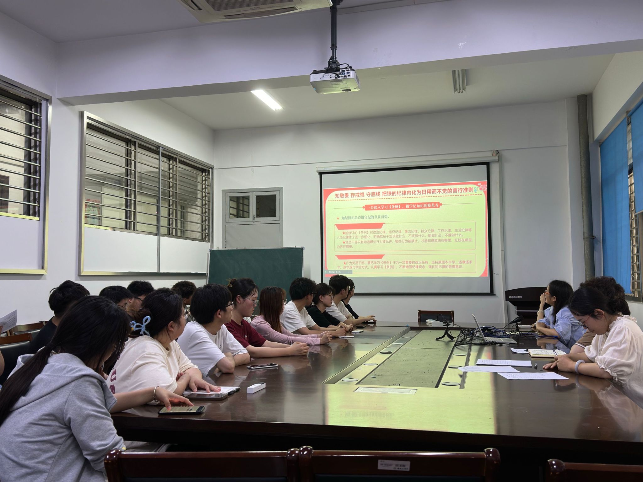 学院学生党支部书记沈丹开展党纪专题学习,深入学习《中国共产党纪律处分条例》,原原本本学原文,逐字逐句读《条例》,深刻领会《条例》的相关规定与要求。最后寄语各位党员要不忘入党初心,牢记党员身份,凝聚思想共识,锤炼党性修养,以昂扬向上的精神风貌回应新时代对党员的新需求、新期待。