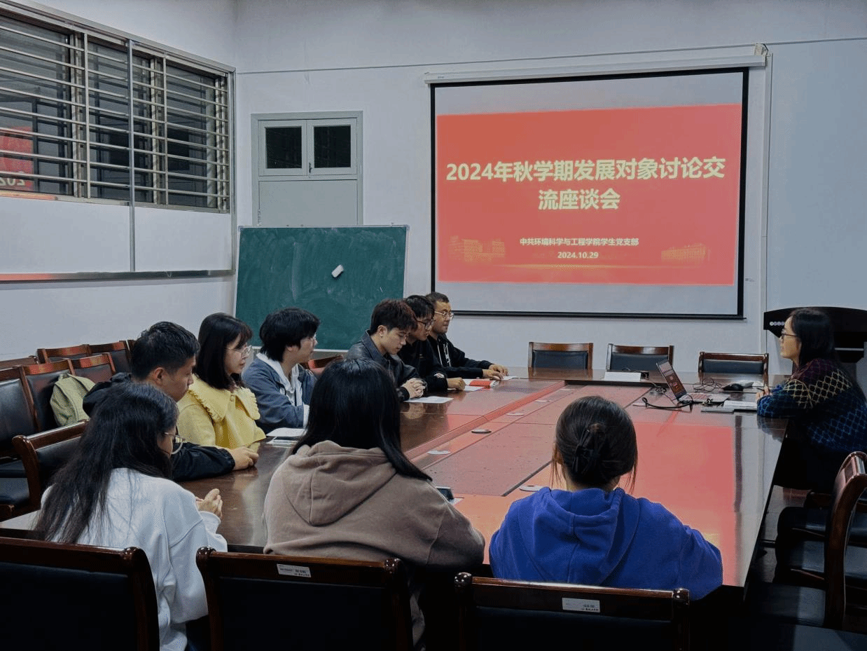 10月29日,环境学院在北校区大学生活动中心三楼学生会议室,召开2024年秋学期发展对象交流座谈会。会议由学生党支部书记沈丹主持,学院秋学期发展对象9人参加。