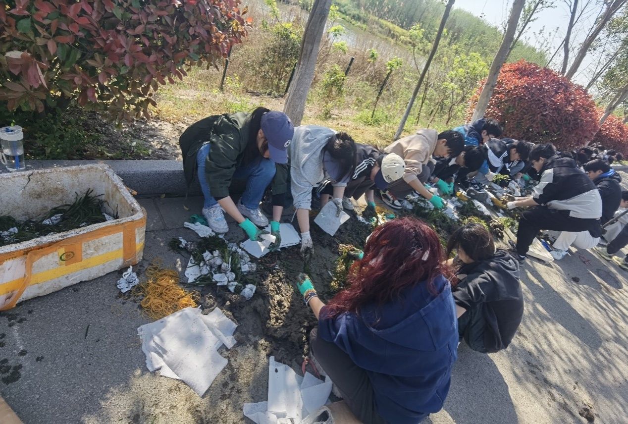 盐龙湖水源地作为盐城市重要饮用水源保护区,其水质安全直接影响数百万居民生活。活动过程中,企业导师杨殿谊、王玲现场讲解“无纺布包裹种植法”的技术原理:通过可降解无纺布包裹沉水植物根系,既能固定植株抵御水流冲击,又能为幼苗提供营养基质,显著提升存活率。学生在专业技术人员的指导下,分组开展苦草、轮叶黑藻等沉水植物的标准化种植,亲身实践“基质配制—植株固定—精准投放”全流程操作。