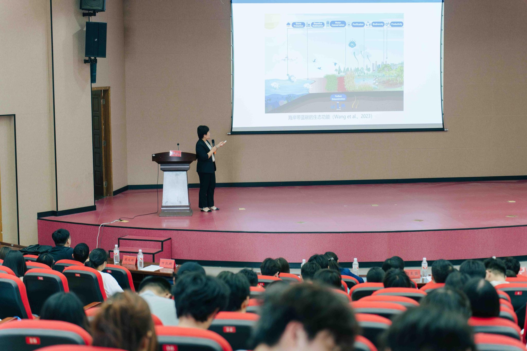 大会最后,江苏省海洋地质调查院副院长、盐城工学院客座教授闫玉茹女士带来了题为“守护蔚蓝 ‘碳’索未来——盐城蓝色碳汇与实践”的精彩讲座。闫教授深入阐释了海洋在全球气候变化中的关键作用,并重点介绍了盐城作为沿海城市在蓝色碳汇研究与实践中的独特优势及进展。她强调,通过科学的海洋管理和生态修复,不仅能促进海洋生态系统健康,更能显著提升海洋碳汇(碳吸收)能力,为应对全球气候变化贡献“盐城力量”。