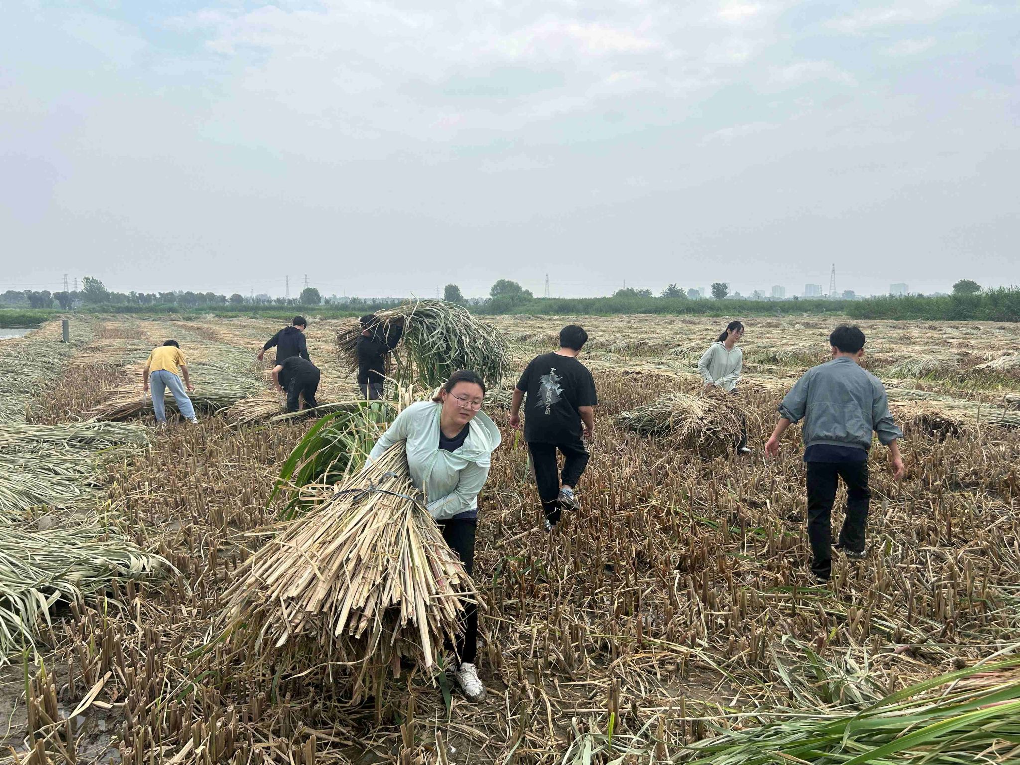 尽管烈日炎炎,实践团的同学们仍干劲十足,分工协作完成a4地块共计16亩的收割任务。拿起从未使用过的镰刀,按照收割后根部残留高度10-15cm的标准,将收割后的茭草捆扎运至隔埂堆放,豆大的汗珠从同学们的脸庞滑落,同学们却难掩激动的心情。