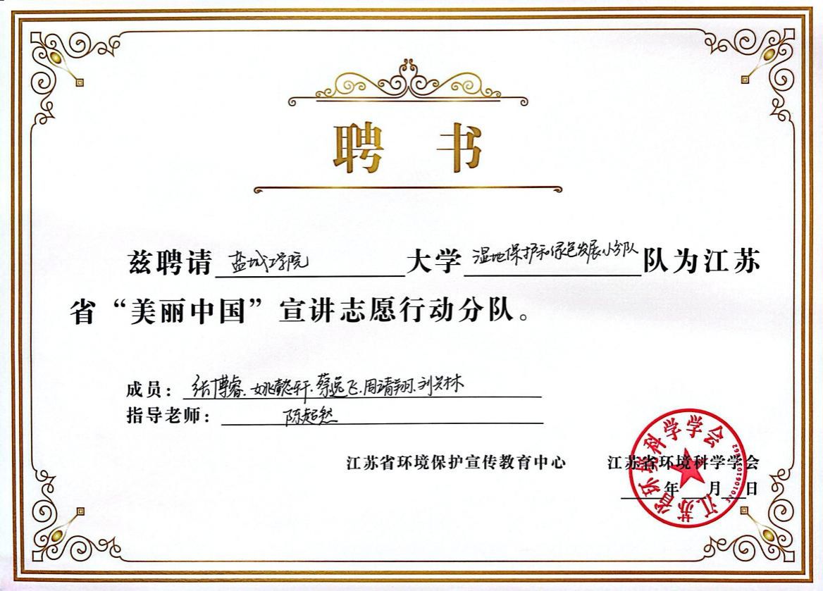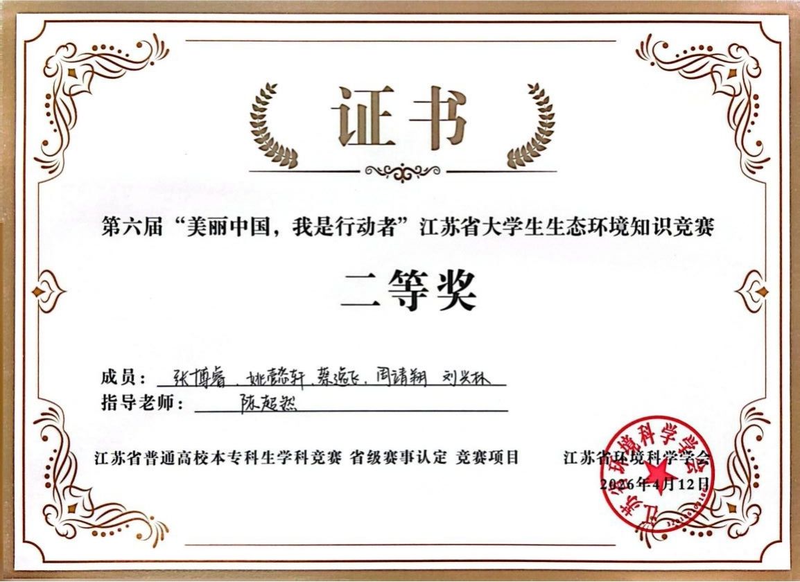 4月12日,第六届“美丽中国 我是行动者”江苏省大学生生态环境知识竞赛决赛在南京落下帷幕,由我院师生组成的参赛团队凭借作品《守护那一份“湿”意与鹿鸣》从全省300余支队伍中脱颖而出,荣获二等奖,团队同时被聘任为江苏省“美丽中国”宣讲志愿行动分队。