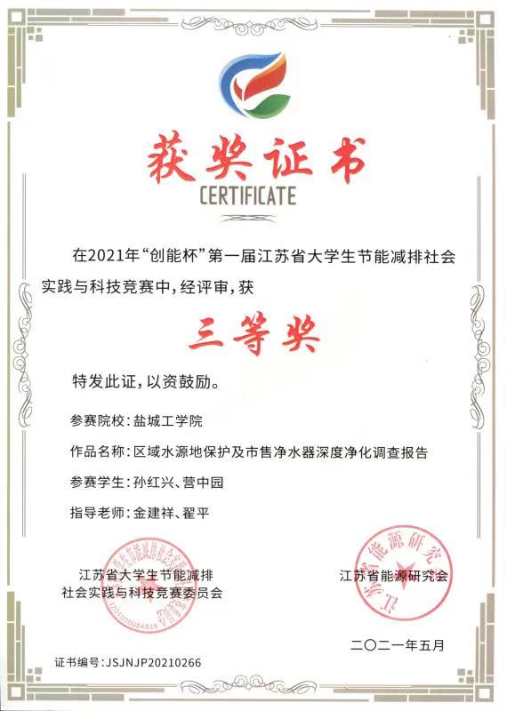 5月15日至16日,由东南大学,江苏省能源研究会主办的第一届江苏省大学生节能减排社会实践与科技竞赛暨“创能杯”全省作品线上初审,决赛在南京市钟山宾馆举办线下决赛答辩。我院金建祥、周英贵老师指导的项目《“会呼吸的树”——节能高效的树形空气净化器》入围决赛,并获得一等奖;金建祥、翟平老师指导的项目《区域水源地保护及市售净水器深度净化调研报告》获得三等奖。