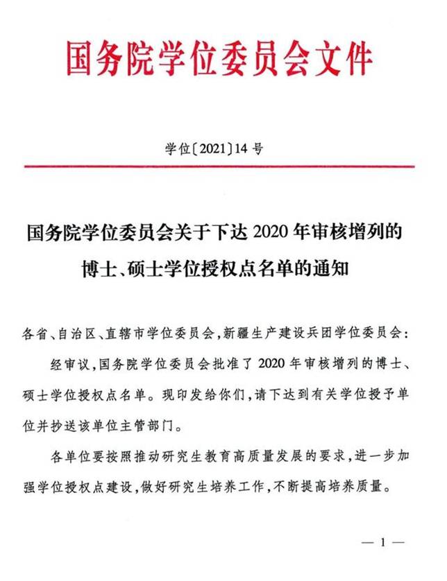 近日,国务院学位委员会下发了《关于下达2020年审核增列的博士、硕士学位授予单位及其学位授权点名单的通知》。经国务院学位委员会审议批准,我院申报的“资源与环境”硕士专业学位授权点获得批准。