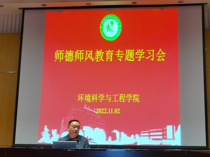 为进一步落实立德树人根本任务,全面加强师德师风建设,不断提高我院教师队伍的政治素质、师德修养和专业素养,11月2日,环境学院在北校区图书馆报告厅召开师德师风专题学习会,会议由院党总支书记陈阳主持,全体教师参加。
