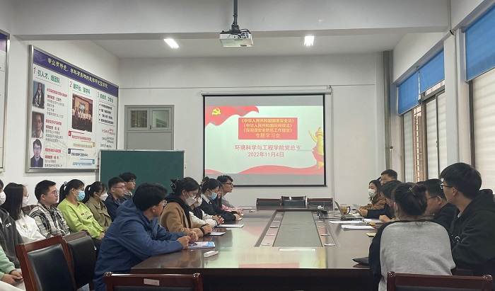 11月7日上午,为贯彻党的二十大精神,增强师生国家安全意识和责任感,筑牢国家安全人民防线,环境学院党总支在会议室组织开展《中华人民共和国国家安全法》等法律法规专题学习。会议由学院党总支书记陈阳主持,党总支理论学习中心组全体成员参加。