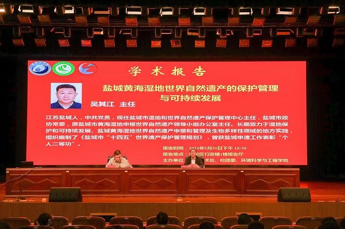 2023年5月31日下午,应学校邀请,盐城市湿地和世界自然遗产保护管理中心吴其江主任在行政楼报告厅举行兼职教授受聘仪式,并为全校师生作了题为“盐城黄海湿地世界自然遗产的保护管理与可持续发展”的学术报告。受聘仪式和学术报告由盐城市政协副主席、副校长丁成教授主持,各二级学院的师生代表聆听报告。
