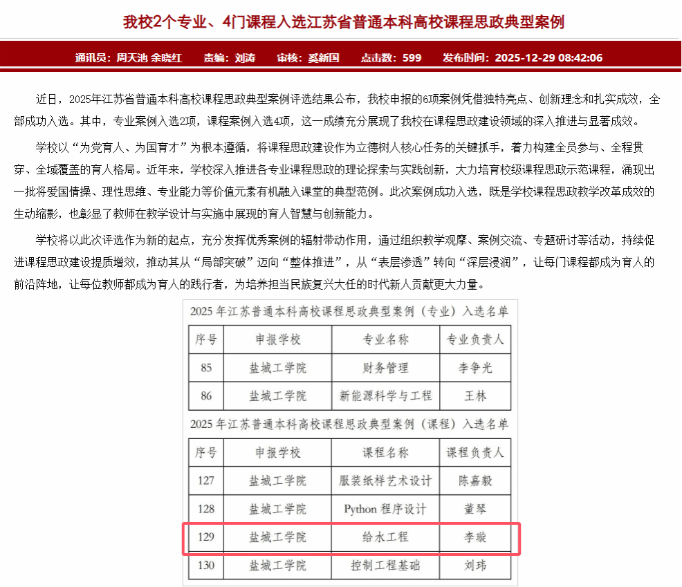 近日,江苏省高等学校教学管理研究会课程思政建设工作委员会公布了2025年江苏省普通本科高校课程思政典型案例评选结果。盐城工学院环境科学与工程学院环境工程专业课程《给水工程》凭借其鲜明的育人特色、创新的教学设计和扎实的育人成效,成功入选省级课程思政典型案例,标志着环境学院在专业教学与价值引领深度融合方面取得了显著成果。
