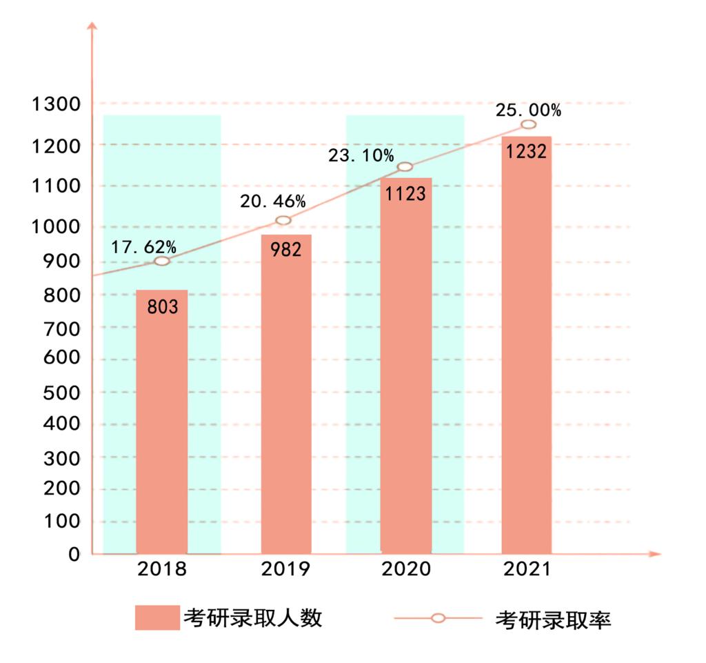 2021年,我校应届毕业生中有1230余人分别考取哈尔滨工业大学、东南大学、香港中文大学、英国爱丁堡大学等国内外知名高校硕士研究生,考研录取率超25%。考研人数和考研录取率再创新高。
