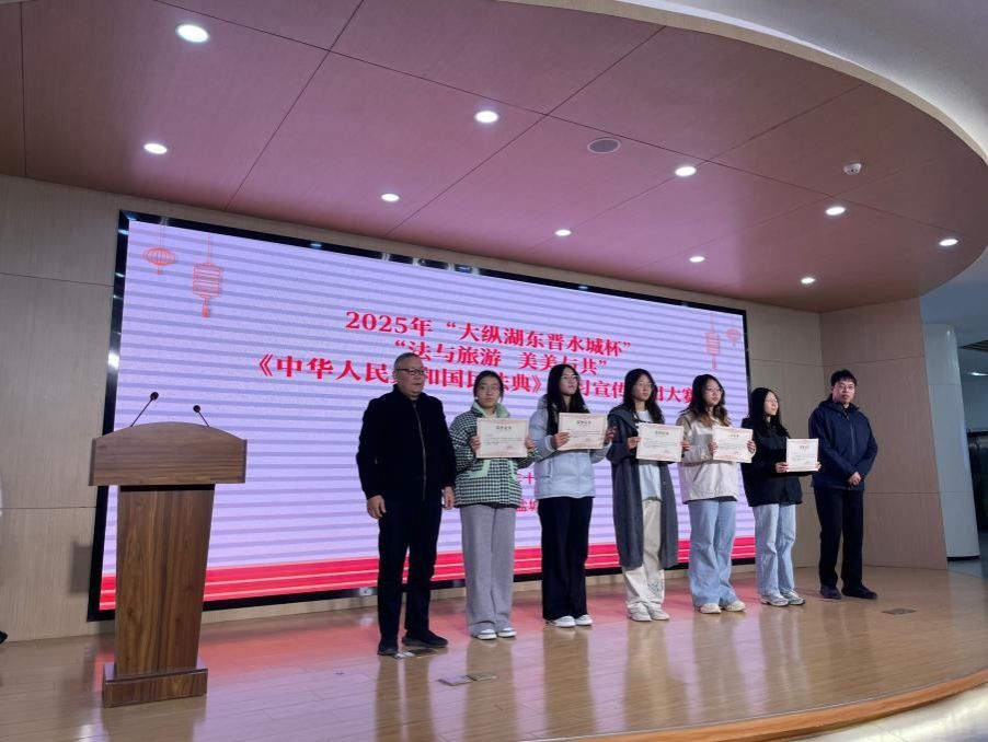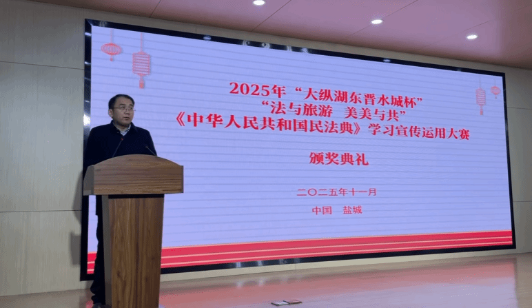 丁成致辞,《中华人民共和国民法典》的颁布实施是全面推进依法治国的重要里程碑,本次大赛创新性地将法治宣传与盐城特色旅游资源深度融合,既是普法形式的生动实践,也为提升全社会法治意识、优化旅游法治环境、推动“美美与共”的和谐社会建设注入了强劲动力。