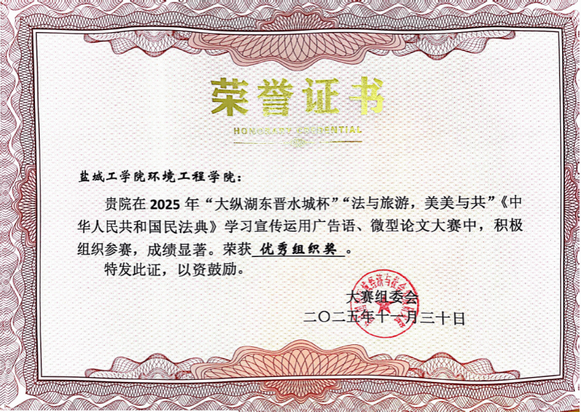 我院积极响应号召,广泛动员学生参与,在赛事中展现出扎实的法治素养与创新能力,B环设252班朱健同学的作品《法与旅游 美美与共》荣获微型论文一等奖,B环工241班吴清雅同学的作品荣获广告语三等奖,学院荣获优秀组织奖。