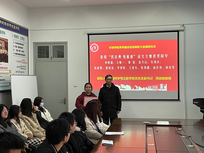 学工办主任沈丹宣读了学风建设工作表彰决定,包括江苏省三好学生徐韵淞、江苏省暑期社会实践先进个人梁晨逸、江苏省“挑战杯”黑科技专项赛获得者吴梦蕾、梅畅、孙红兴、江苏省节能减排创意大赛一等奖获得者苏发敏受到了表彰。团委副书记陈超然宣读了“民法典.亮旅游”征文大赛获奖名单,包括单明阳、王唯一等11位同学。周政分别为获奖同学颁奖。