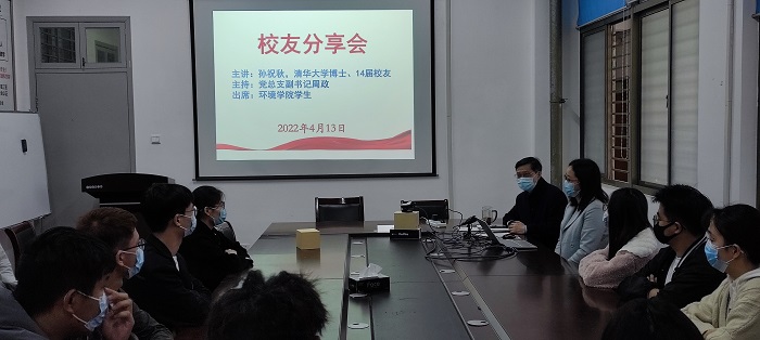 4月13号下午,学院在会议室举办“咬定目标,发奋努力,终会成才”校友分享会。2014届环工校友、清华大学博士孙祝秋主讲。会议由党总支副书记周政主持,学工办主任沈丹、学生代表在会议室集中收看,400多名学院师生通过腾讯会议参会。