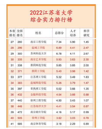 近日,中国管理科学研究院《中国大学评价》正式发布武书连2022中国大学排行榜。我校位列全国本科高校第296位,连续四年排名进入前300。江苏省大学综合实力排名中,我校名列28位,已经连续四年处于前30。 学校长期坚持应用型高校的办学定位,统筹推进疫情防控和学校事业高质量发展,大力加强内涵建设,全面深化内部改革,综合实力不断增强。我校已全面开启建设全国一流应用型大学新征程,正激励着全体盐工人继续保持追求卓越的强劲动力,积极主动融入新发展格局,努力在开新局中奋勇争先。 武书连中国大学评价排行榜1993年6月首次发布,是国内颇具影响力的大学排行榜之一。本次发布的武书连2022中国大学排行榜是国家财政拨款的802所公办本科大学。
