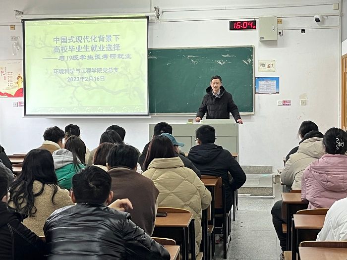 党总支副书记周政在会上指出,当前大学生就业形势依然严峻,更需要大家把握春招机会,积极行动起来。尤其是在党的二十大报告中明确提出将绿色环保产业作为战略性新兴产业,环境专业大有可为。在进行就业选择时,要客观看待个人条件和社会需求,从实际出发选择职业和职位。基层是锻炼自身能力的广阔舞台,不失为一个好的就业选择。对于考研同学而言,笔试通过之后,还需认真做好面试或调剂工作,要树立紧迫感,利用多方资源,实现自己的梦想。