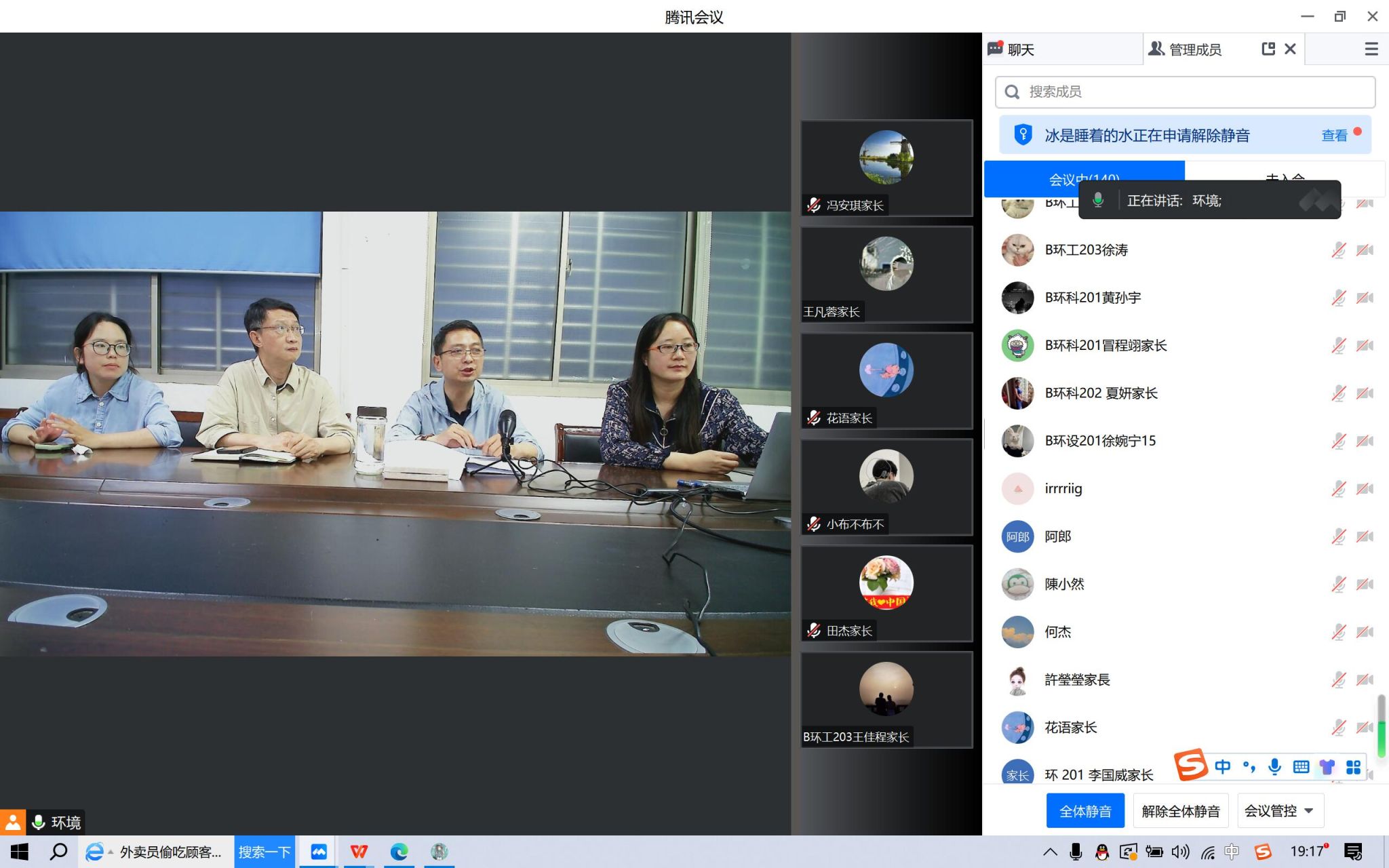 为进一步增进家长、学院与学生之间的互动联系,引导2020级考研学生健康成长,6月19日晚,环境学院在会议室通过腾讯会议线上举行“空中教室”家长会,会议由学工办主任沈丹主持,学院党总支书记陈阳、副书记周政、2020级辅导员陈超然以及2020级全体学生家长参加。