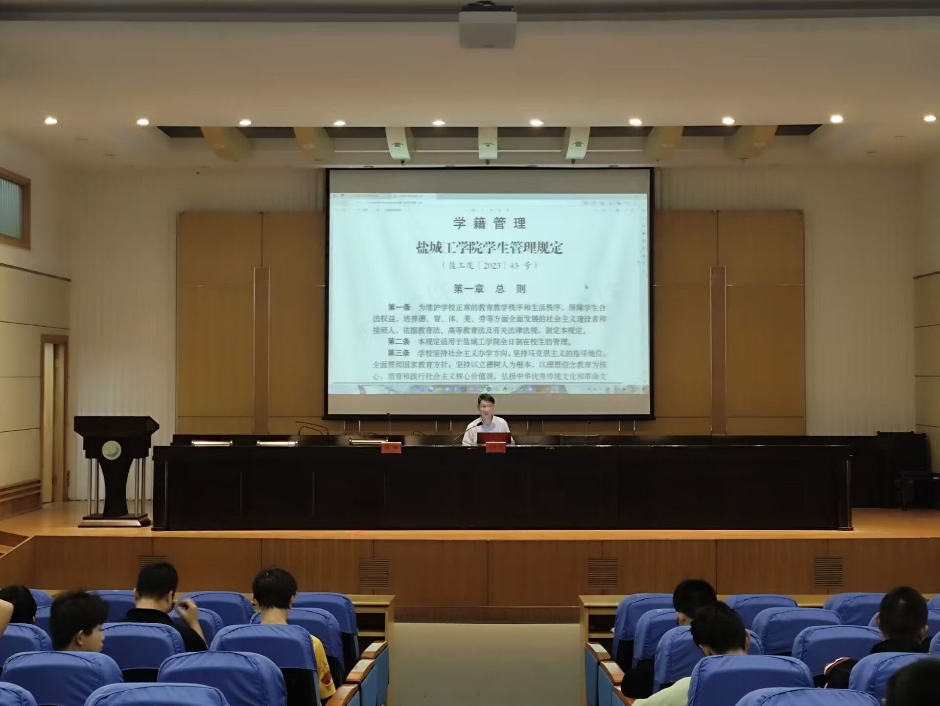 周政向同学们详细讲解《盐城工学院学生管理规定》,他要求同学们应认真学习管理规定上的条例,树立学习目标,合理制定大学规划,在学习上求真知、务实才,生活上求真情、务实心,争做勇于创新、敢于担当、奋发有为的时代新人。
